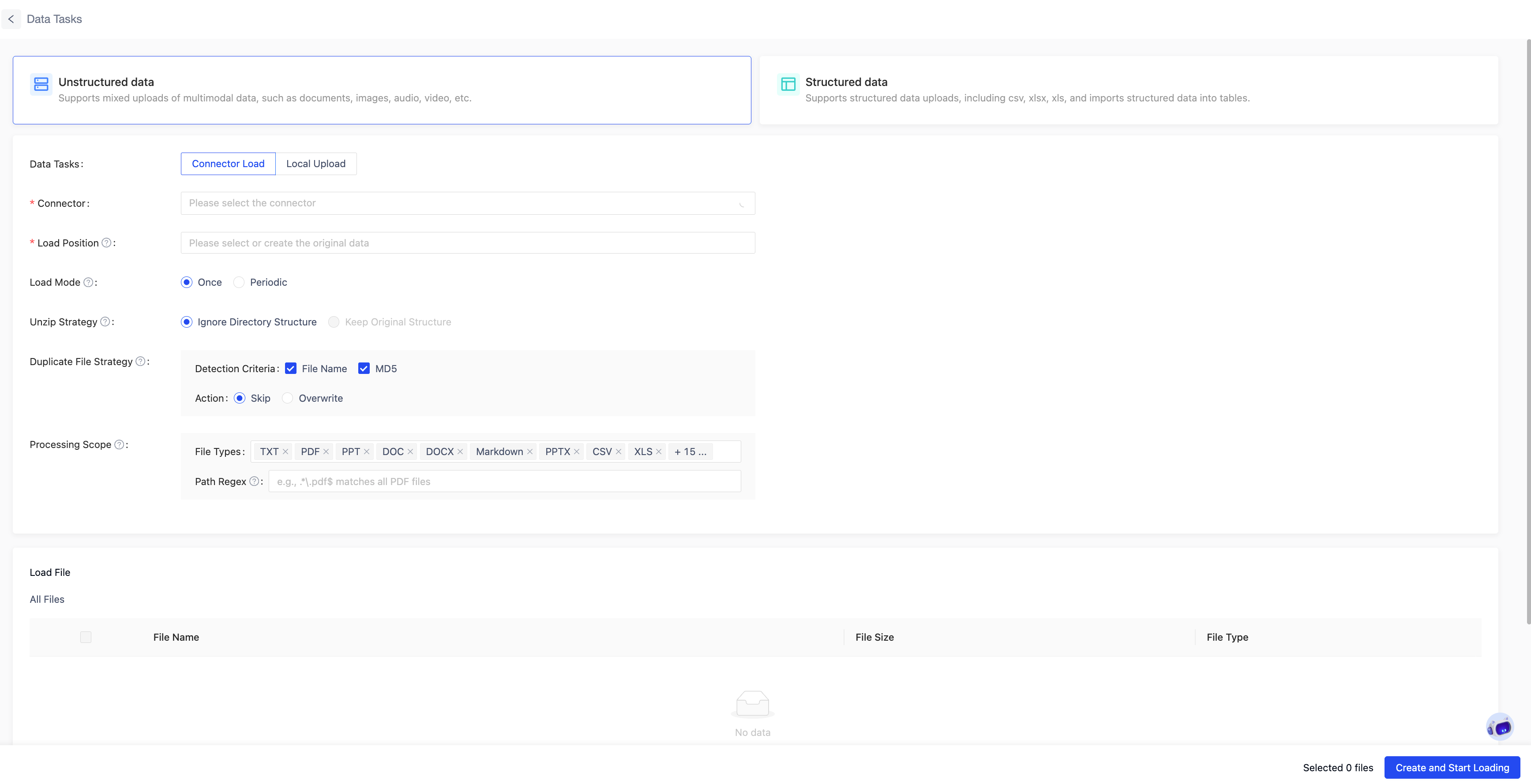 - Connector Files: Select files from configured data connectors; the system automatically reads the contents of the corresponding directory.