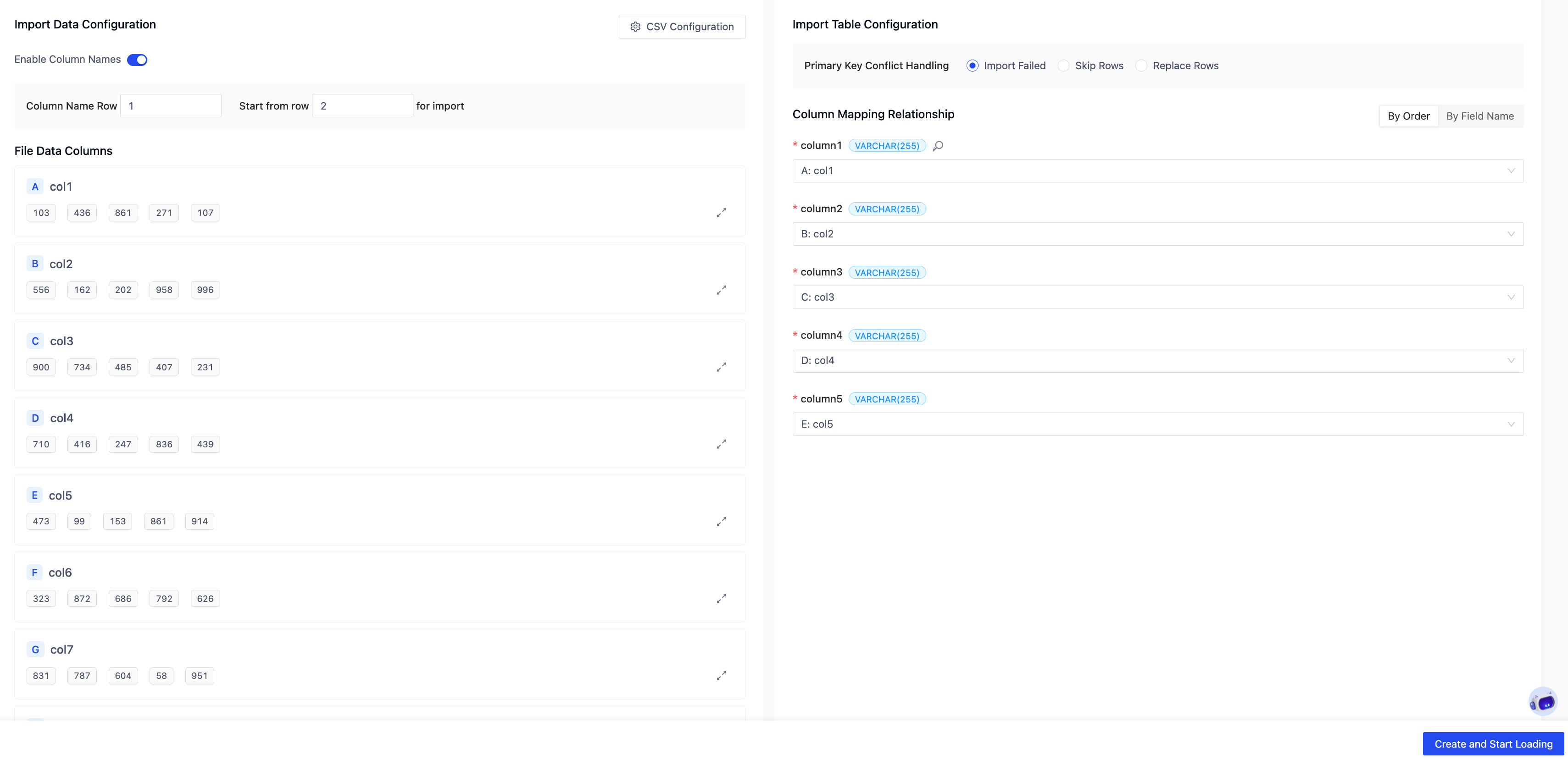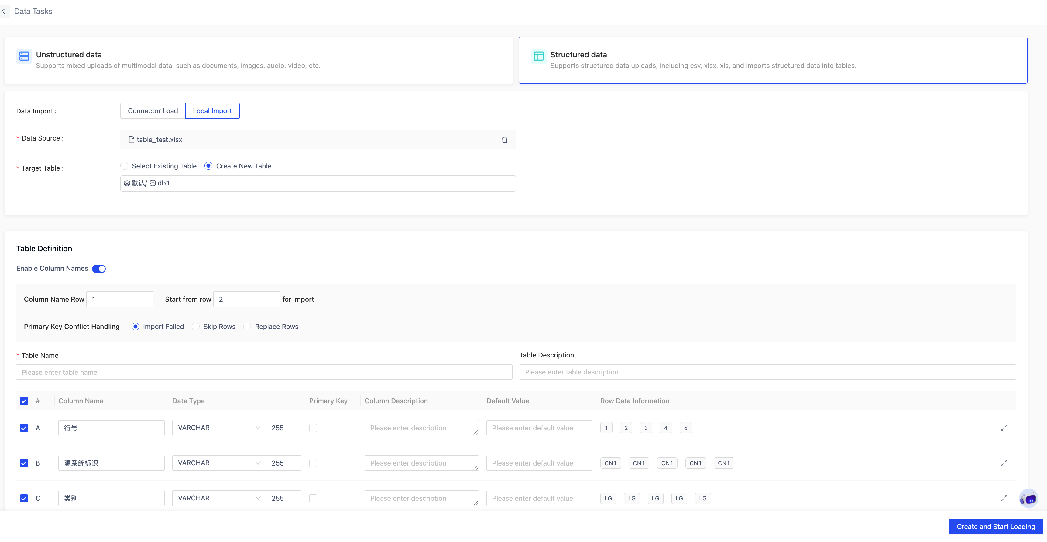 During the loading process, the system previews the first 5 sample data rows starting from the specified data start row. If the data start row exceeds 1000, the preview cannot be displayed.