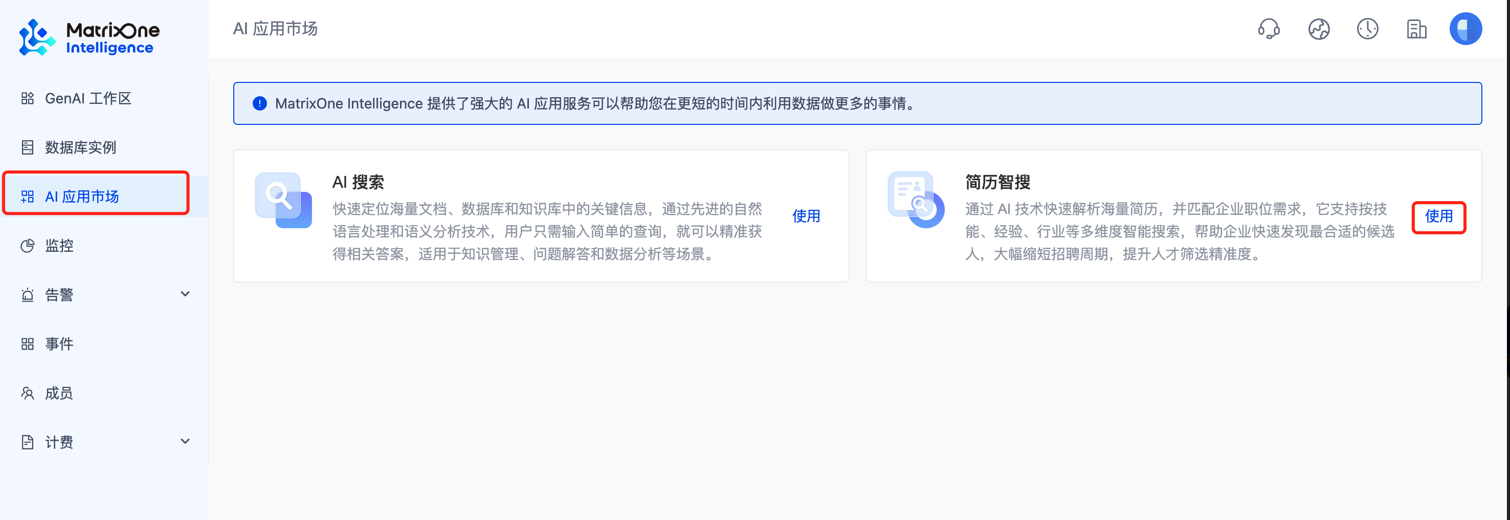 First, log in to the MatrixOne Intelligence management platform, click theAI Application Market in the menu bar on the left, and then click theUsebutton on theResume Intelligence card to enter the MatrixSearch search platform and start using it.