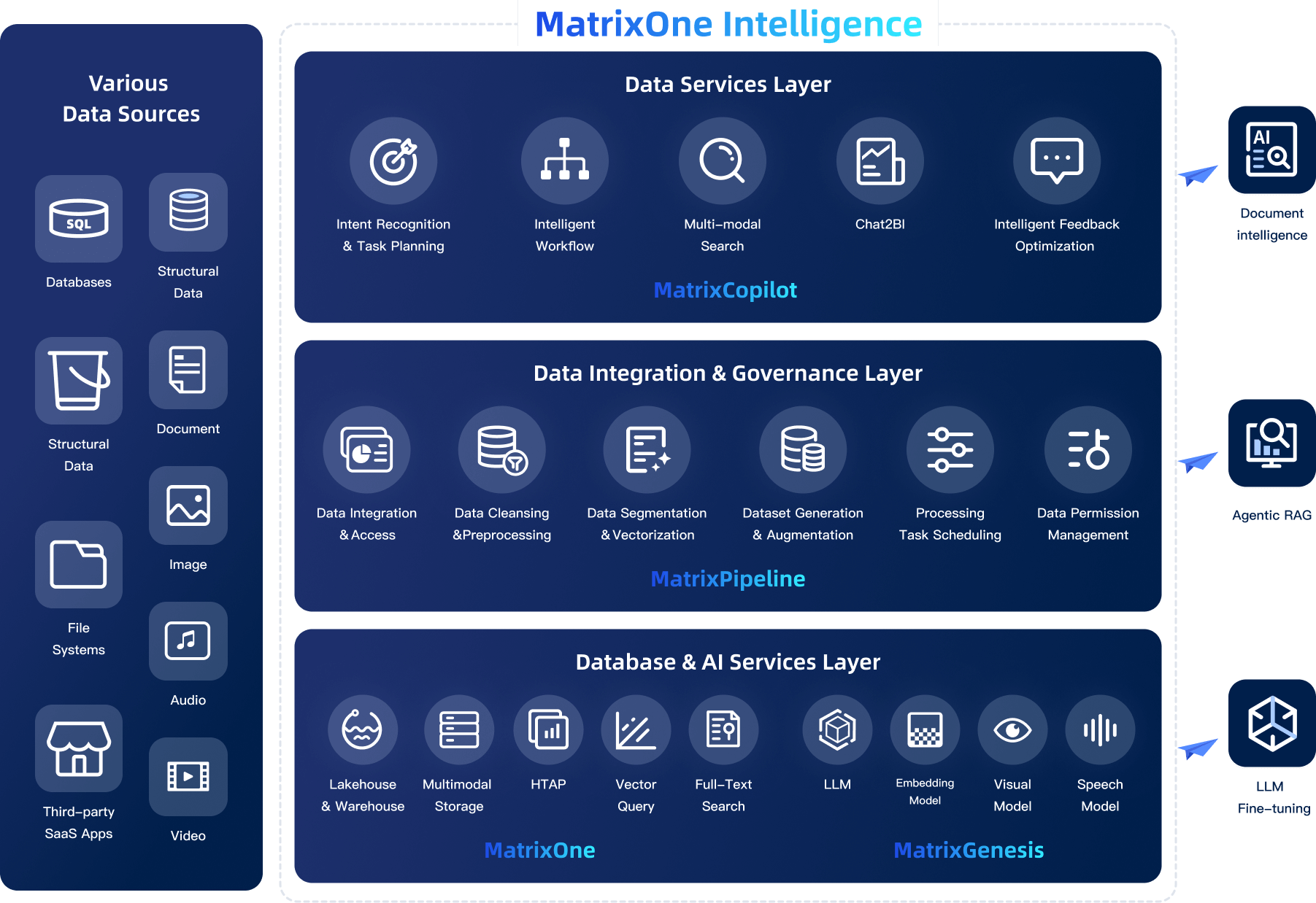 MatrixOne Intelligence forms an end-to-end data intelligence architecture through a robust data and AI foundation, unified data integration and governance, and user-friendly data service agents.