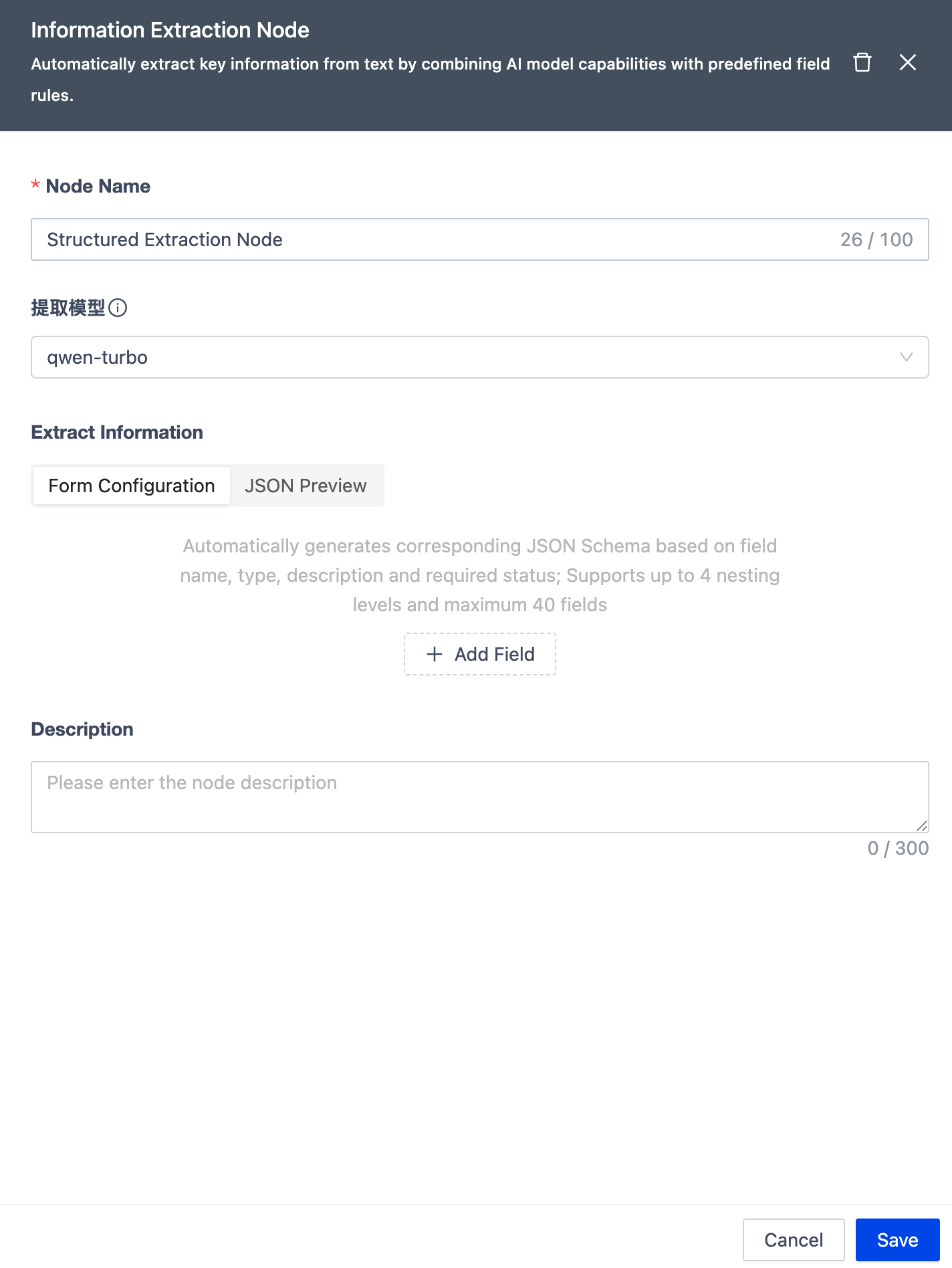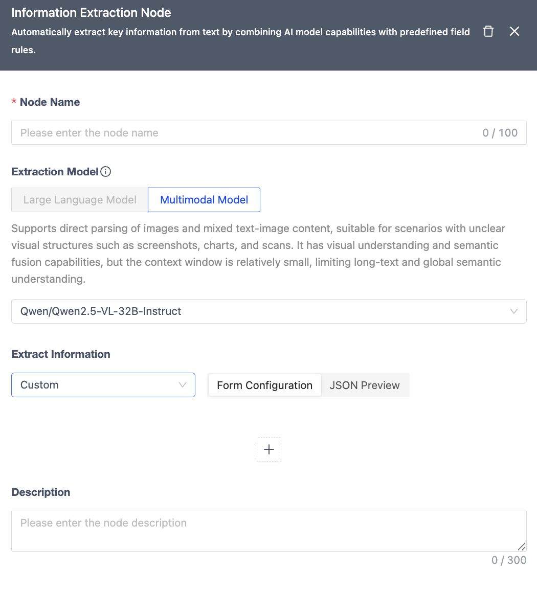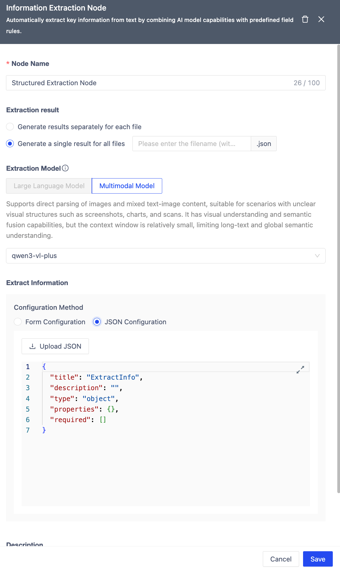 This release enhances the Information Extraction node by adding multi‑file merge extraction, which allows unified extraction and consolidation of information from multiple files to meet cross‑file information aggregation and analysis needs. It also supports uploading local JSON files to automatically generate extraction schemas, significantly reducing configuration overhead in complex scenarios and improving information integration efficiency and ease of use.