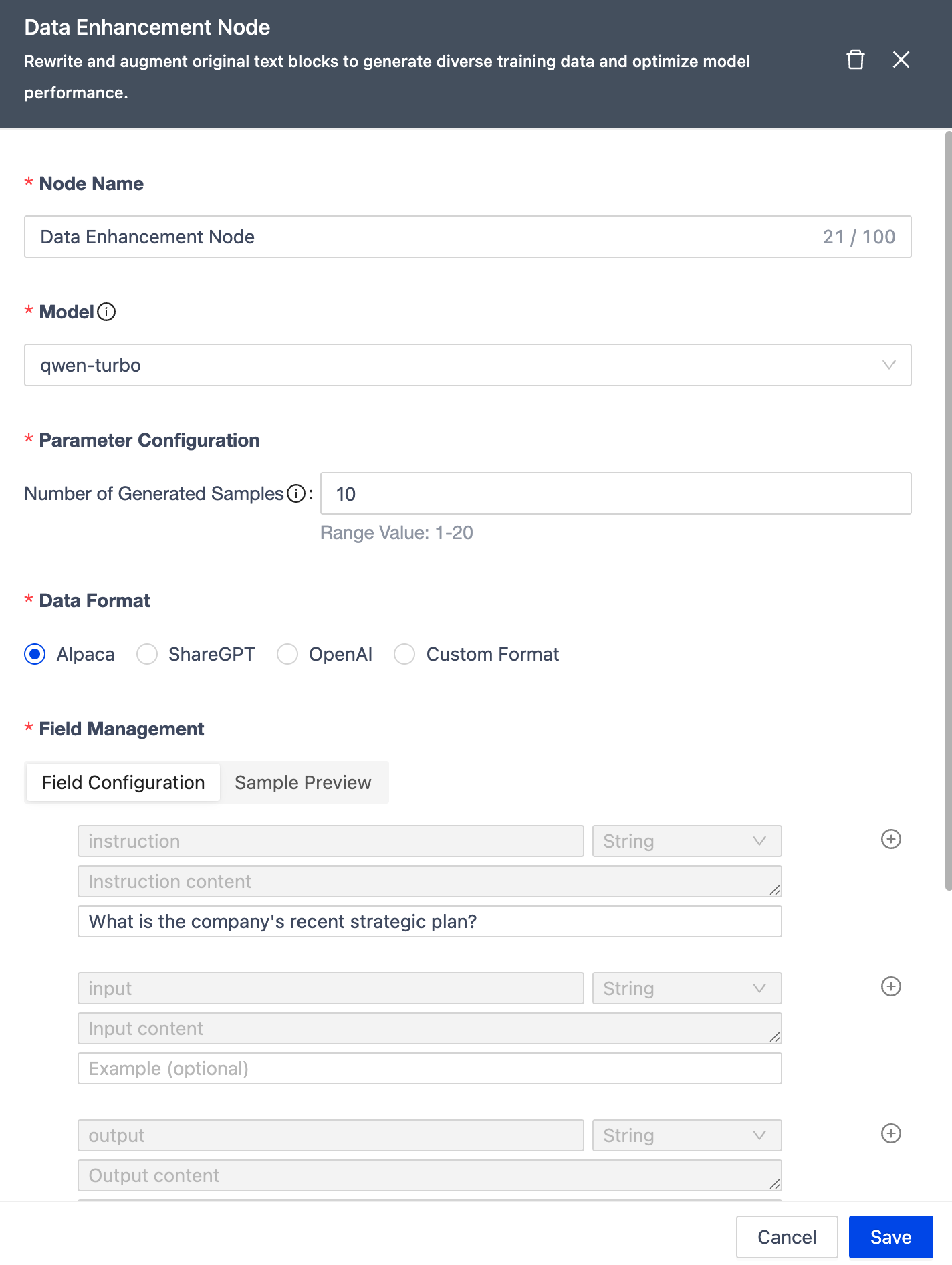 - Data Enhancement Operators: Supports automatic generation of datasets in Alpaca format, suitable for instruction fine-tuning, dialogue training, intent recognition, and other scenarios.