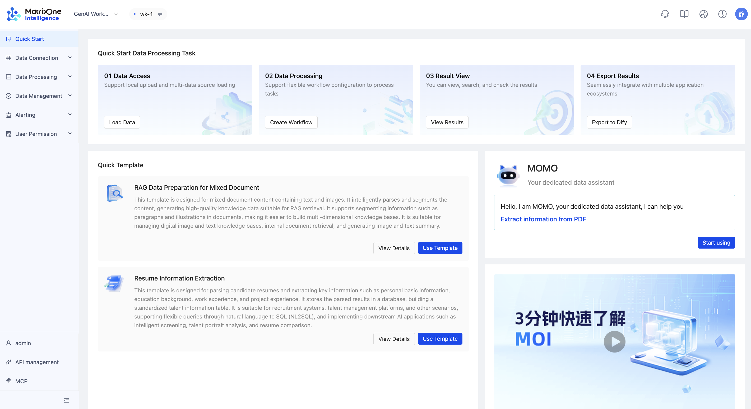 This update adds comprehensive support for local files. The APIs can now handle both publicly accessible files from the internet and locally uploaded files, meeting diverse data access needs. Furthermore, we have decoupled and opened access to the atomic capabilities of core nodes such as segmentation, embedding, and information extraction. This improvement significantly reduces the complexity of orchestrating workflows using the APIs, helping users build workflows on MOI more efficiently and with a lower barrier to entry for processing data.