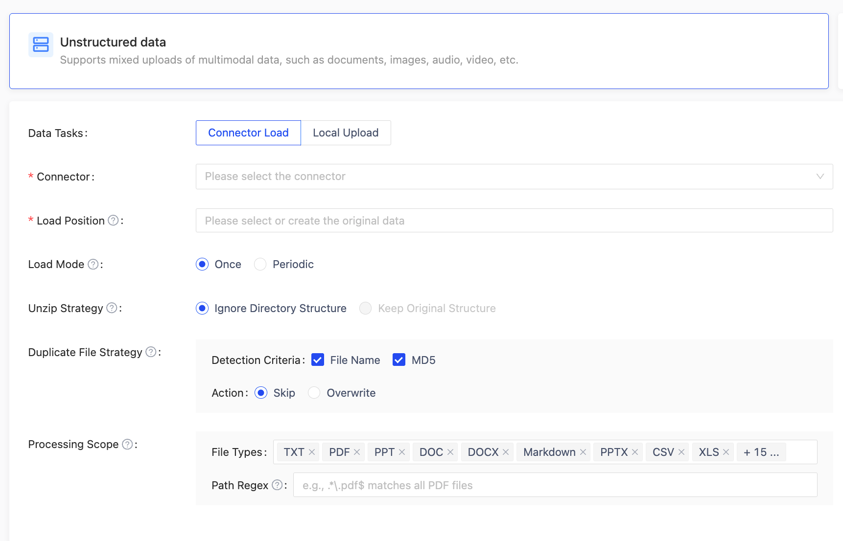 Added automatic decompression support for compressed files and intelligent deduplication based on file names and MD5 during the loading process, effectively avoiding the storage and processing costs caused by duplicate data. It also supports fine‑grained filtering by file type and regular‑expression rules on file paths, helping users manage massive unstructured data more efficiently and improving data preparation efficiency and data quality.