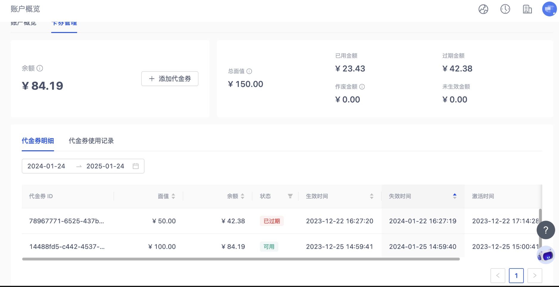 您可以通过对代金券有效期的筛选来查看您代金券的明细。只有状态为可用的代金券才可以进行扣费,余额 = 总面值 - 已用金额 - 过期金额 - 作废金额 - 未生效金额。