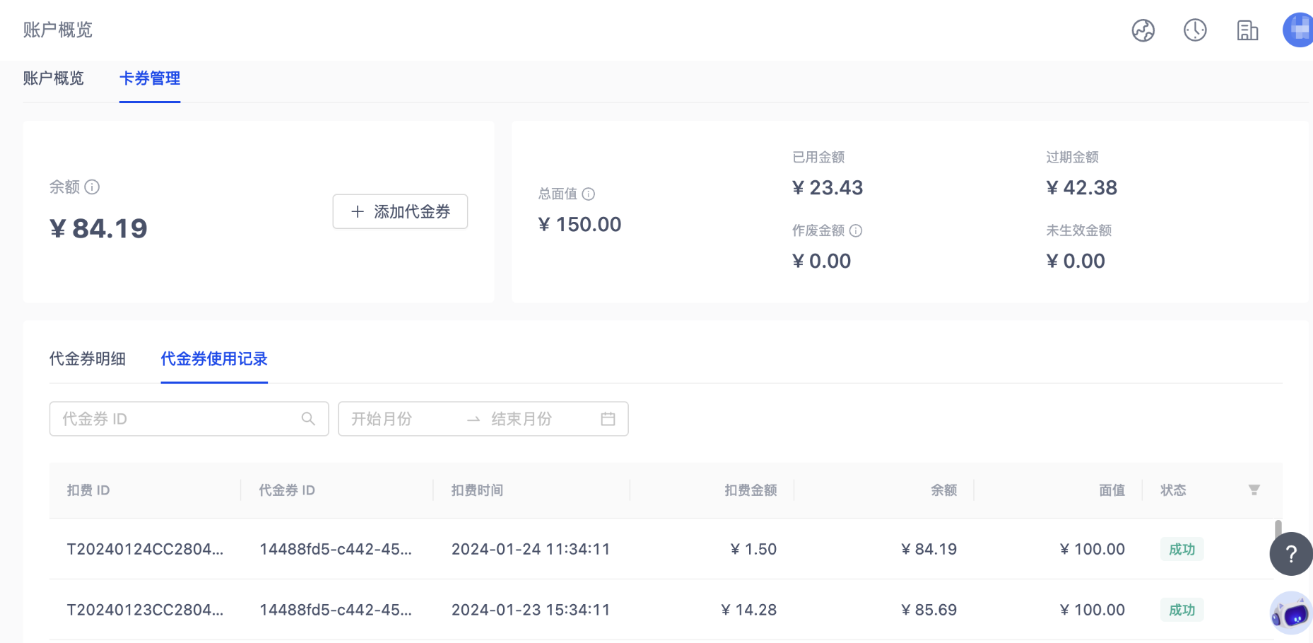 在代金券使用记录中您可以根据代金券的 ID 和有效时间筛选您想了解的卡券使用情况,代金券 ID 不支持模糊查询。扣费状态分为成功和失败,扣款失败您账户的余额将不会发生变化。