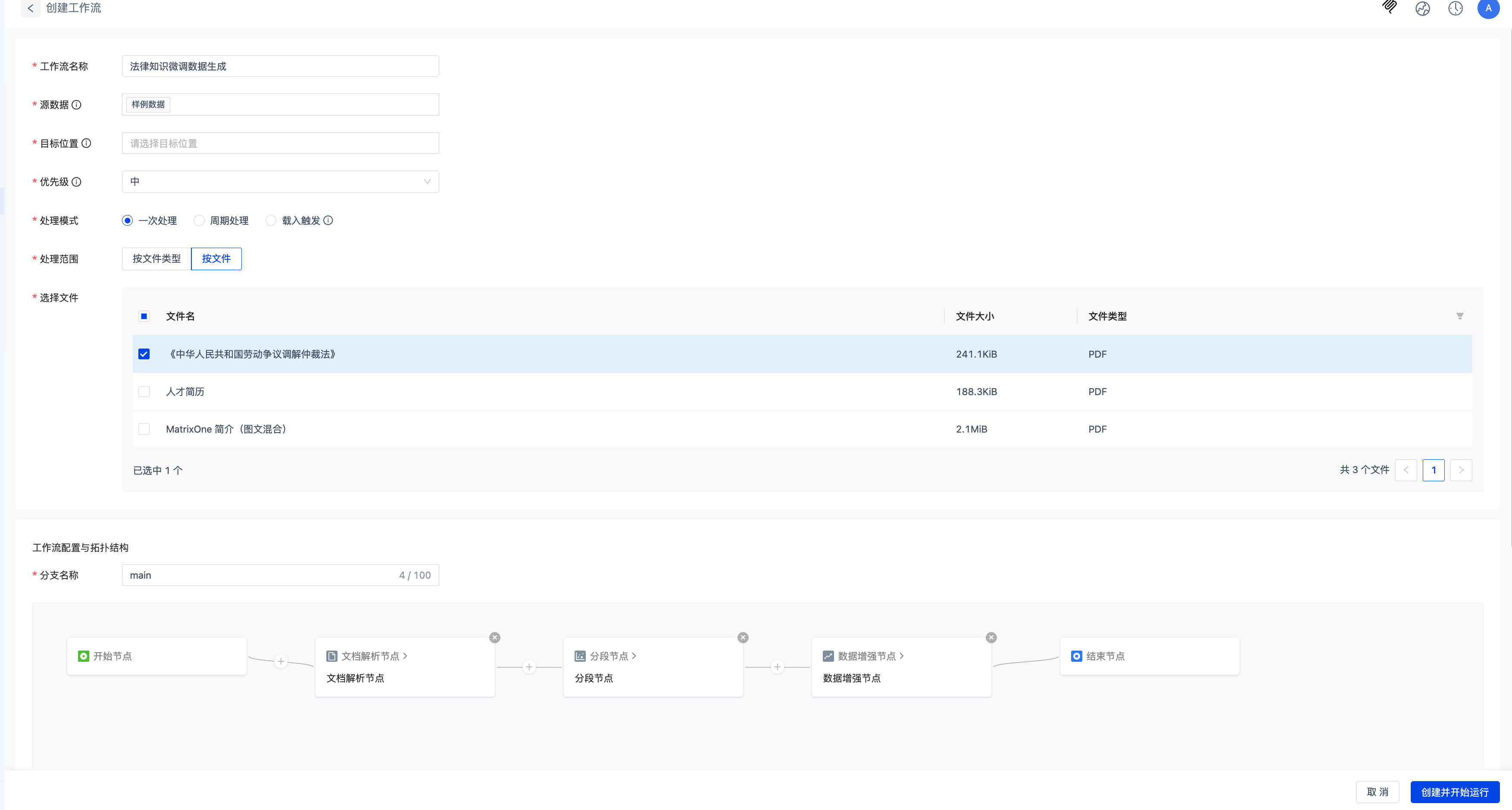 - 在模版列表选择法律知识微调数据生成模版,在模版列表或详情页点击使用模版,即可创建数据处理任务并快速生成对应工作流。