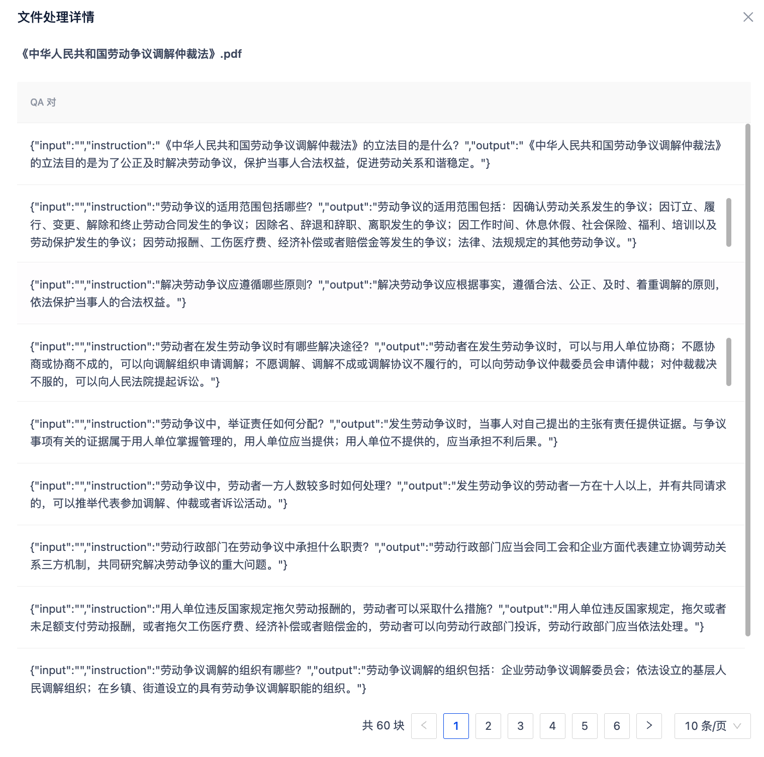 处理完成后,可将数据集导出用于后续模型训练。这里我们直直接点击数据中心文件右侧的下载按钮,导出完成后,解压后你将获得一个如 中华人民共和国劳动争议调解仲裁法.pdf.jsonl 的标准问答对数据集。