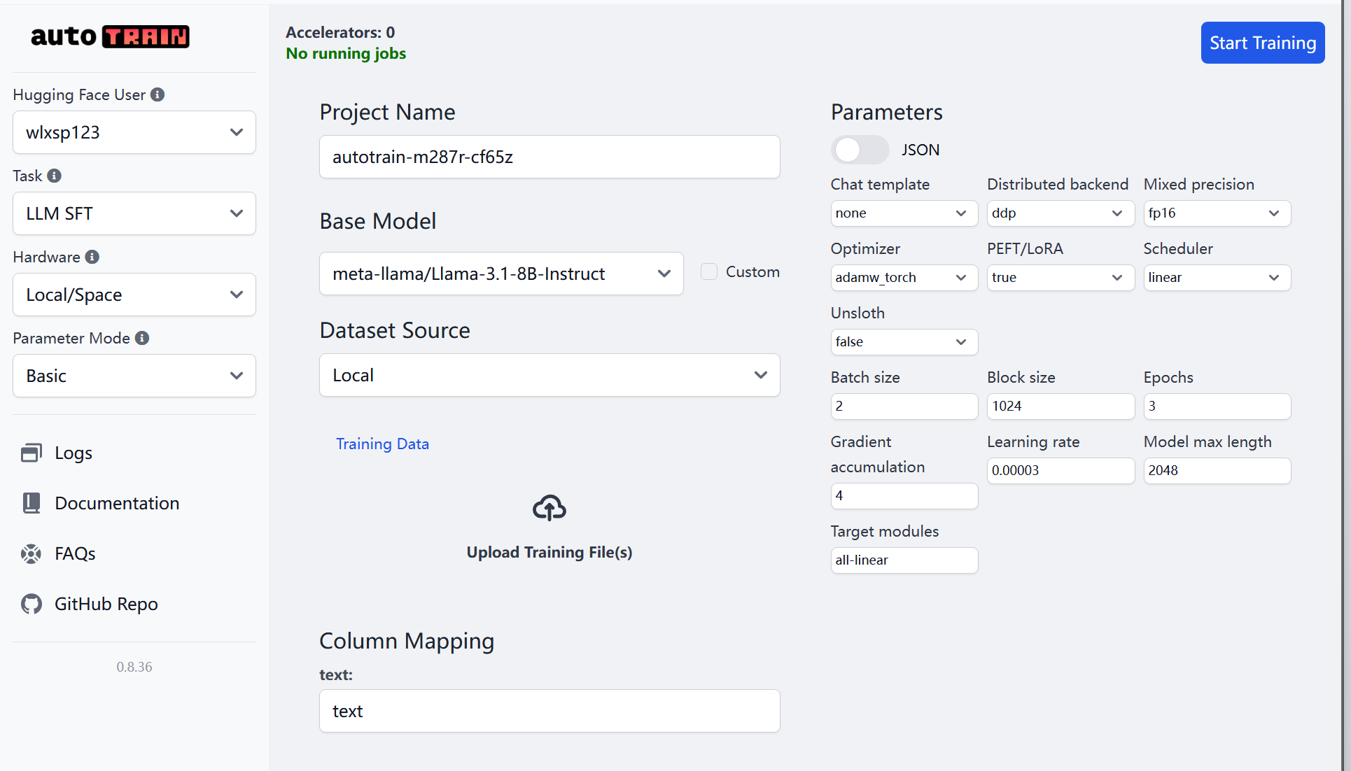 AutoTrain 将自动为你完成环境部署与训练过程。训练完成后,你将得到一个具备专业法律问答能力的微调模型,可直接部署或在平台中调用。