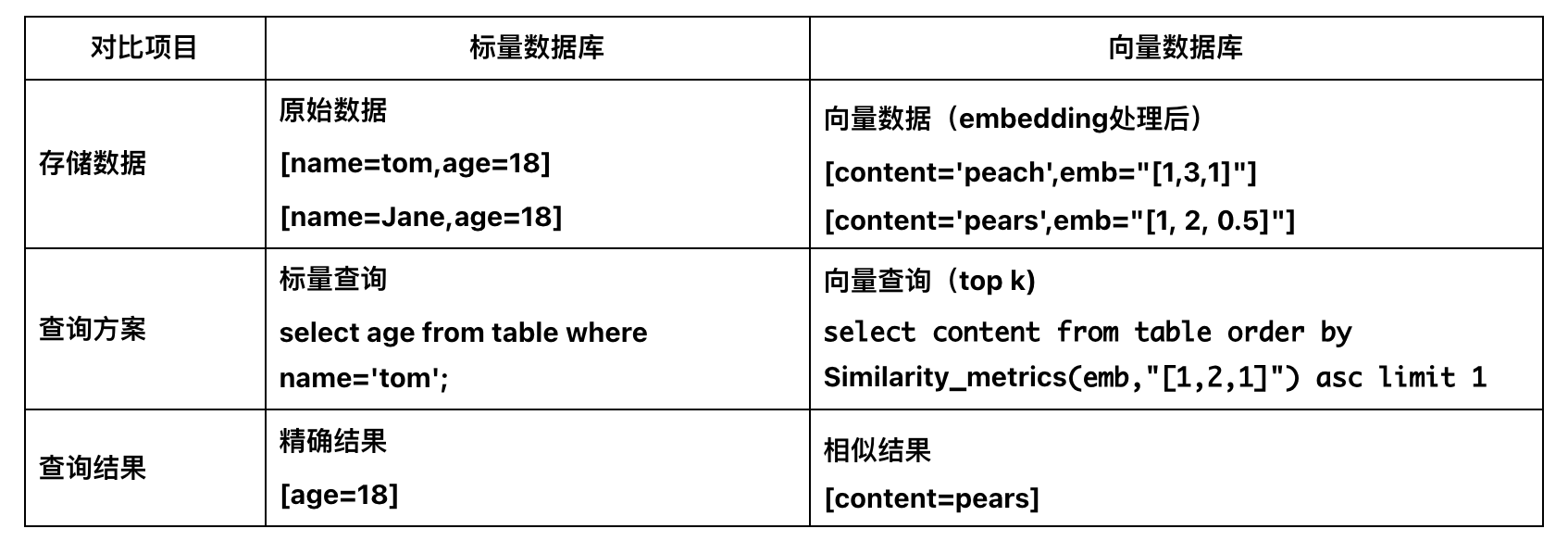 - 在标量数据库中存储的是原始数据。例如,用户数据可能以表格形式保存,包括字段如姓名、年龄等。中执行查询返回的是精确匹配的结果。例如,查询 name = 'tom' 的年龄时得到精确返回。