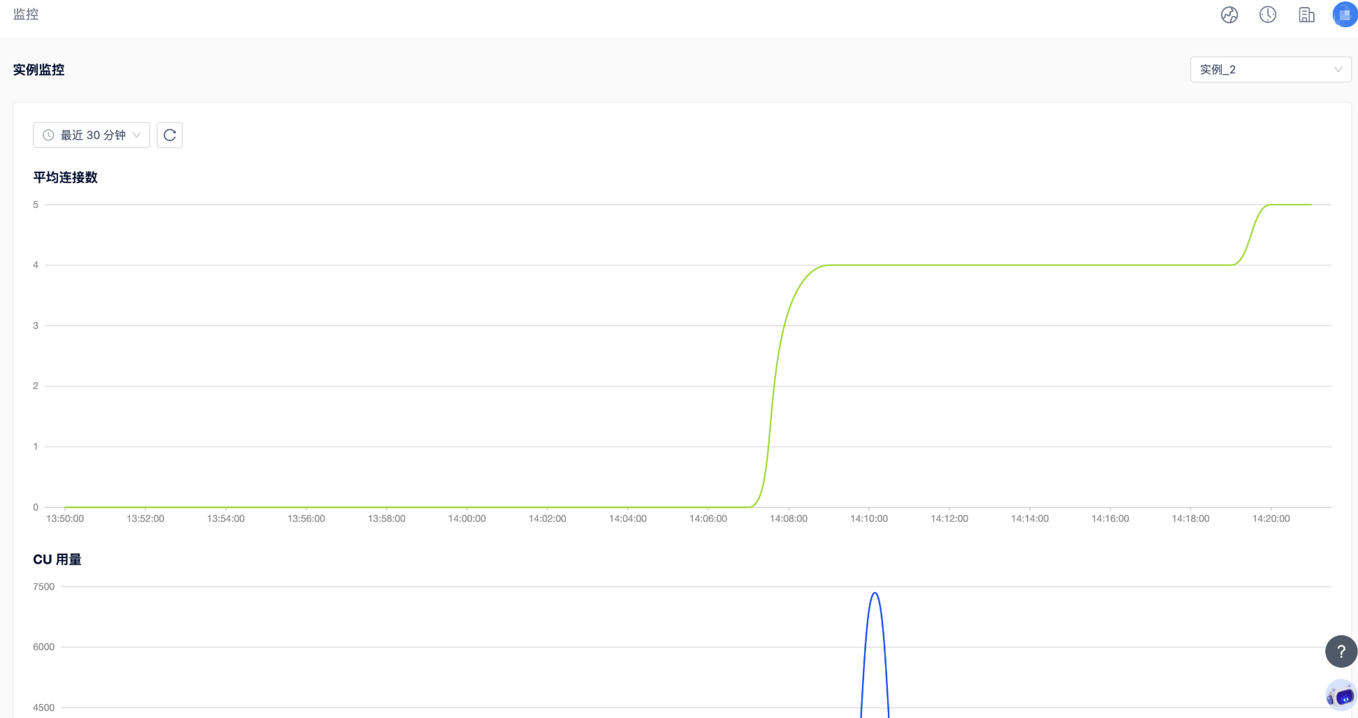 实例监控指标是服务于 MatrixOne Intelligence 实例管理平台的运维人员的监控信息,您可以点击右上角的实例名列表来切换您想了解的实例信息,包括:平均连接数,CU 使用量和存储用量。对于 CU 和存储的使用信息您也可以直接点击实例界面您想了解的实例,跳转至实例详情中查看。