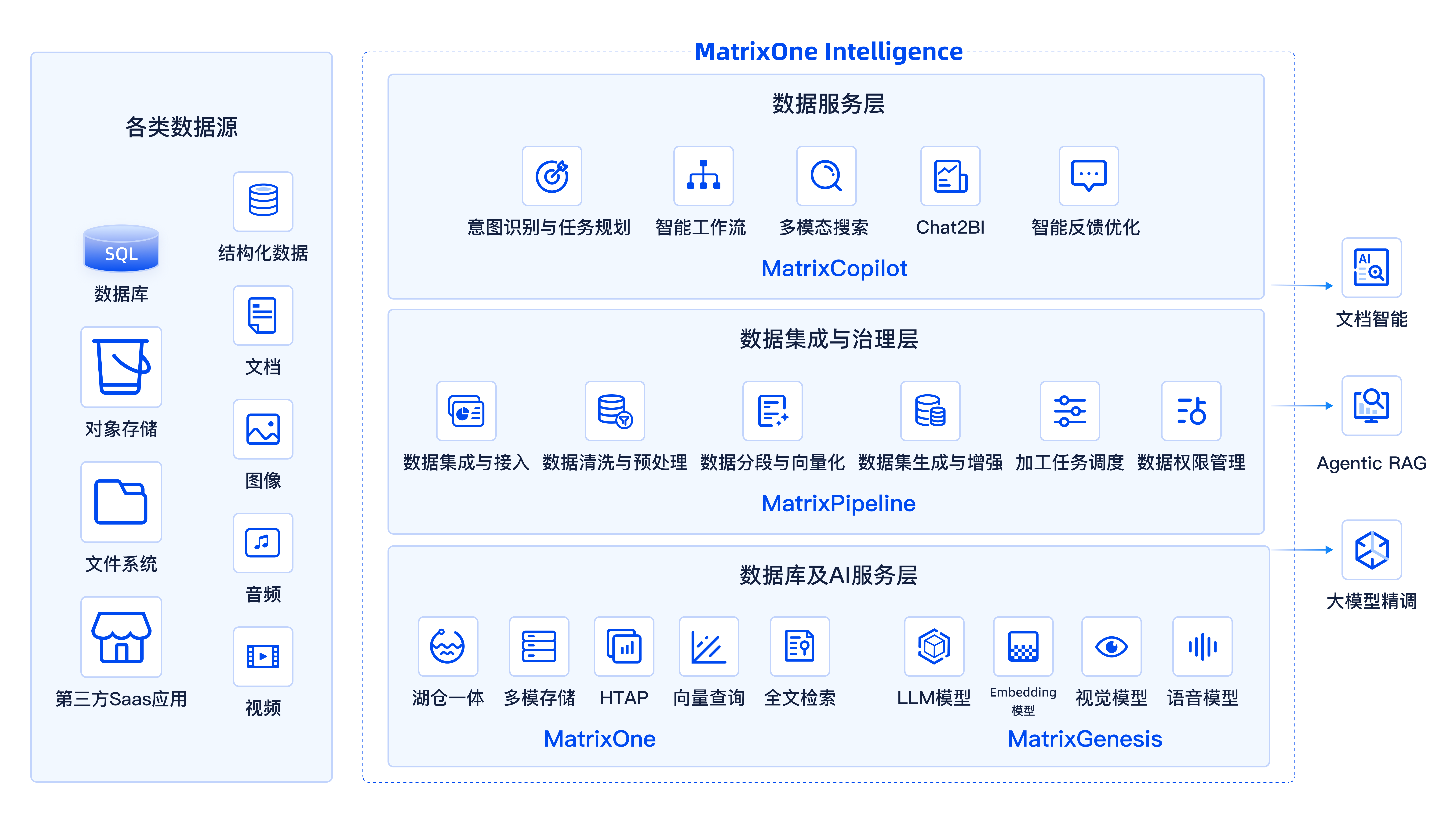 MatrixOne Intelligence 通过强大的数据与 AI 基座、统一的数据集成与治理及简便的数据服务智能体,形成了一套端到端的数据智能架构。