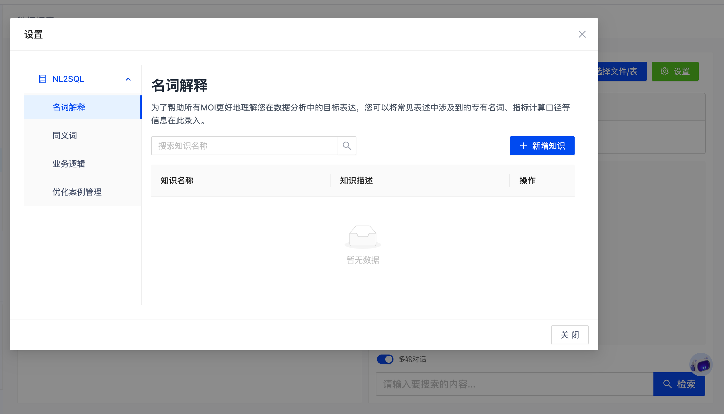 用于定义业务术语及指标口径。为了帮助 MOI 更好地理解您在数据分析中的目标表达,您可以将常见表述中涉及到的专有名词、指标计算口径等信息在此录入。