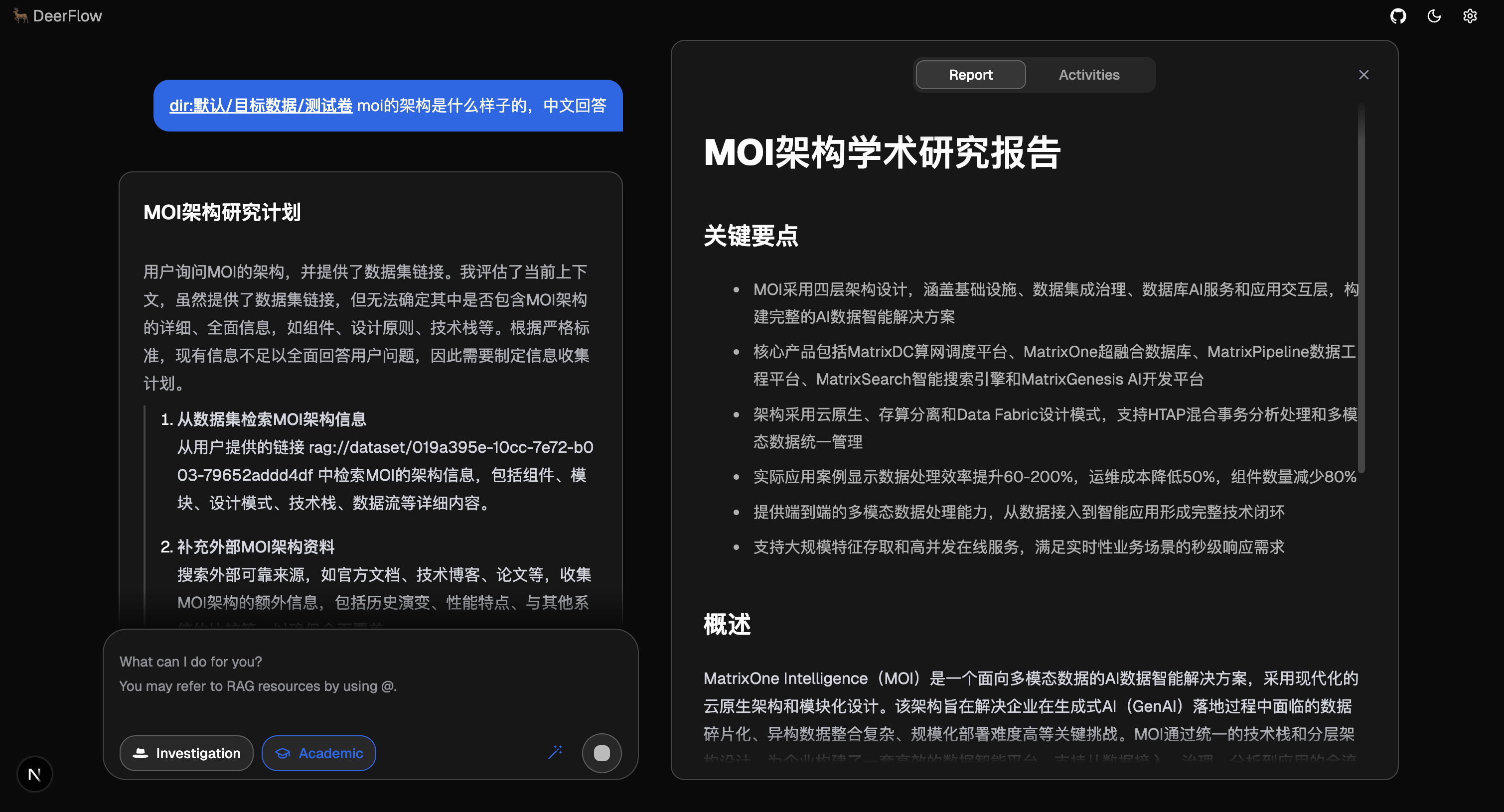 通过以上步骤,您就可以成功将 DeerFlow 与 MOI RAG 服务集成,构建功能完整的检索增强生成应用。